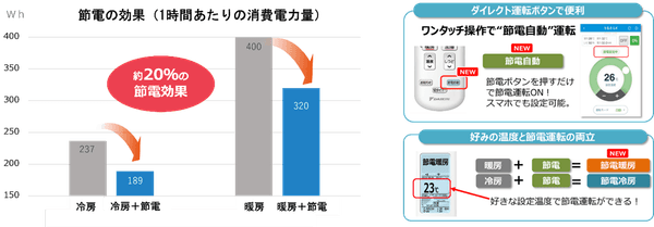 当社は、エアコンの運転時間の約80%※3を占める安定運転時(設定温度に達した後の室温を維持する運転)の節電に着目しました。本商品では、当社独自のスイングコンプレッサーを活用し、安定運転時の消費電力量を約20%削減※4する「節電自動」を新たに搭載します。「節電自動」ボタンを押してエアコンを起動すると、外気温に応じた設定温度をエアコンが自動的に判断し、節電につながる冷房運転や暖房運転を行います。また、通常の冷房運転または暖房運転を開始した後に「節電自動」ボタンを押せば、好みの設定温度で節電することも可能です。快適性の向上を目指す従来からの「AI快適自動」に加えて、効率的な運転を優先する「節電自動」を搭載し、多様な選択肢を提供します。