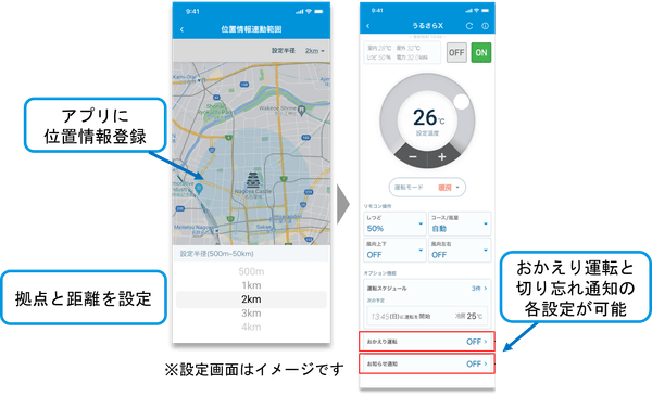 スマートフォンアプリ「Daikin Smart APP」を使用すると、スマートフォンを使って外出先やエアコンが設置されていない部屋からでもエアコンの運転操作ができます。スマートフォンの位置情報を示すGPSと運転設定を連動させる「おでかけ切り忘れ通知」と「おかえり運転」をアプリに新しく追加しました。