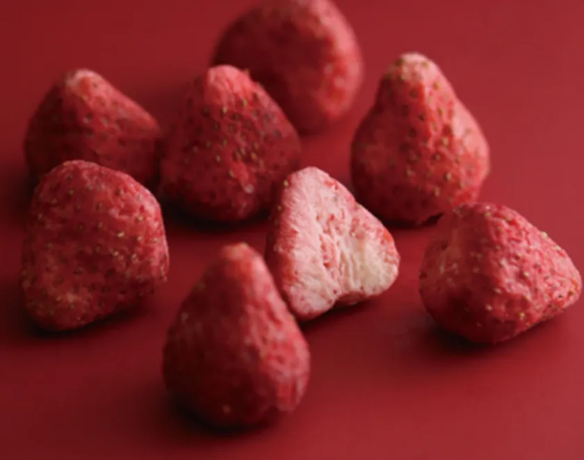 『とろけるいちごプレミアム』は、国産のフリーズドライの苺に、厳選したベルギー産ホワイトチョコレートを浸み込ませたスイーツです。生の苺をフリーズドライすると、中に空間が生まれます。その空間に、特殊製法でホワイトチョコレートを浸み込ませることで、サクッとした心地良い食感とホワイトチョコレートの口溶けが融合し、サクトロっとした食感を生み出します。苺本来の持つ酸味とチョコレートの程良い甘味が女性やお子様に大人気の商品です。