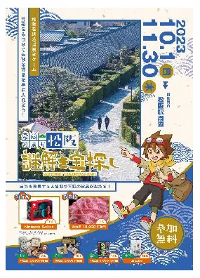 松阪駅周辺の豪商エリアを巡る謎解き宝探しゲーム。豪商のまち松阪 観光交流センター、もしくは松阪駅観光情報センターで「謎解きマップ」を受け取り、まちを歩きながら謎を解いていきます。最終問題を解き明かして宝箱に書かれた合言葉を報告すれば、クリア賞(オリジナル認定証)がもらえます。さらにアンケートに回答すれば、抽選でNintendo Switchや松阪牛などの豪華賞品が当たります。また、「謎解きマップ」のご提示で、市内の豪商施設3館(旧長谷川治郎兵衛家、旧小津清左衛門家、原田二郎旧宅)へそれぞれ割引料金で入館いただけます。