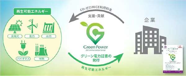 グリーン電力証書システム※2により、イベントや会議などの開催時に会場で使用する電力を、再生可能エネルギーに置き換えます。実際に使用されたエネルギーが再生可能エネルギーの環境価値としてどれほどなのかを算出し再生可能エネルギーを調達、事後検証も含めてパッケージにした商品です。
