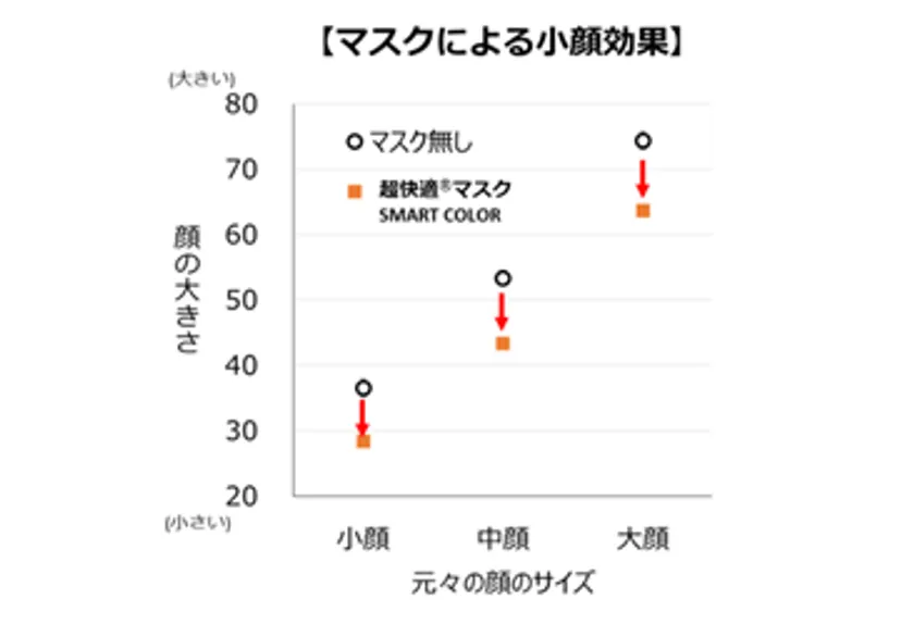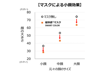 ・ 北海道大学 河原純一郎教授ならびに福山大学 宮崎由樹准教授との共同調査・研究によると、『超快適(R)マスク SMART COLOR』を着用された方は、顔の大きさにかかわらず、マスクをつけていないときよりも小顔に見えることが確認できました。