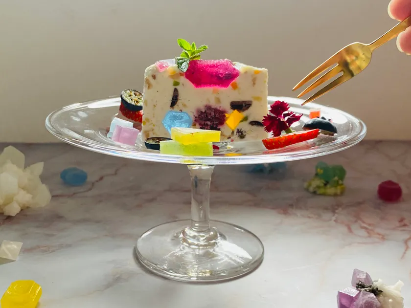 また、断面にあらわれる琥珀糖がステンドグラスのようにキラキラと透けて美しいのが宝石のカッサータの特徴です。