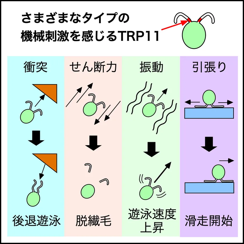 動物の繊毛は「動く繊毛」と「動かないが感覚器として働く繊毛」の2種類があると考えられていました。しかし、「動く繊毛」が感覚器としての機能を持つかはよく分かっていませんでした。そこで、単細胞生物のクラミドモナスを用いて「動く繊毛」が、力や変形という機械刺激を感じるかを調べました。その結果、衝突、振動、せん断力、滑り力というさまざまなタイプの機械刺激を繊毛にあるTRP11という受容体型イオンチャネルで感じ、そのタイプに応じて繊毛の運動パターンを変化させていることが明らかになりました。この成果は、動く繊毛が周囲の力学的環境を自ら感じ、運動を制御しているという新しい可能性を示しています。繊毛という微細な装置に、汎用性が高いセンサーと多機能な運動装置が備わっているということは生物の精緻さを考える上で興味深い発見です。