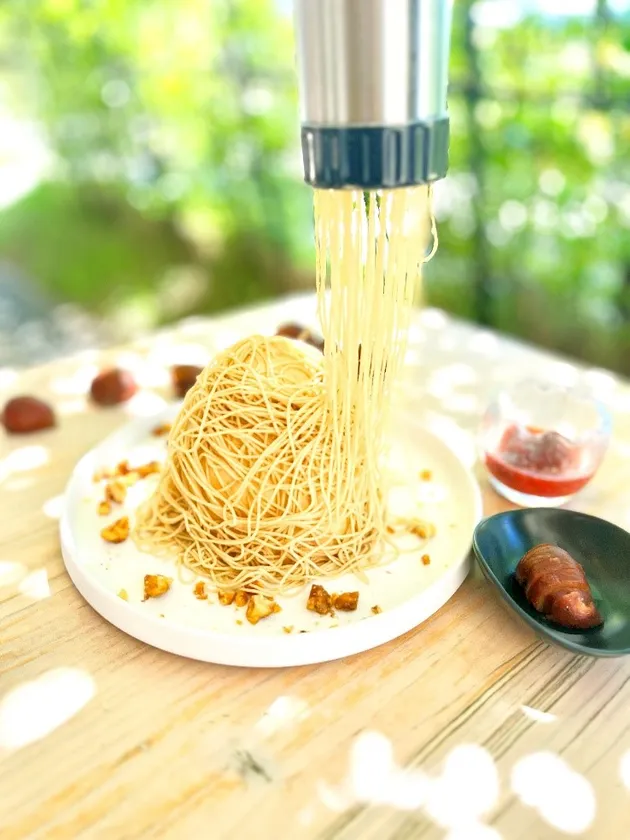 ふわふわのパンケーキ、ほうじ茶プリン、日の出たまごのカスタード、アーモンドナッツ入りのカリカリメレンゲを重ね、最後に栗のモンブランクリームをお客様の目の前で絞ります。LIVE感も楽しみながら、さらにクルミのキャラメリゼとスライスの和栗で食感も楽しめるパンケーキです。今年は和栗を最後まで楽しめるように伊豆産いちごとイチジクのソース付です。