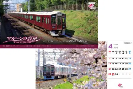 この、「マルーンの疾風(かぜ)」は、四季折々の美しい阪急沿線を疾走する阪急電車の写真が人気で、毎年、多くの方からご好評をいただいております。壁掛け版は8300系車両に装飾を施した「Memorial 8300」が表紙を飾ります。また、卓上版では京都線を疾走する特急用車両9300系が表紙となります。
