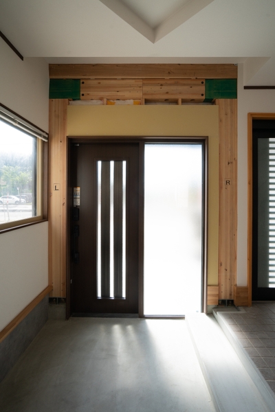 間取りのリフォームで肝心なのは強度を落とさないことです。日本で初となる組み合わせとなるYKK AP社の「FRAMEⅡ」と「M30 顔認証自動ドア」を採用した玄関部では、柱や梁の代わりに大きな空間を支える門型耐震フレームで、大空間リフォームを可能にしました。