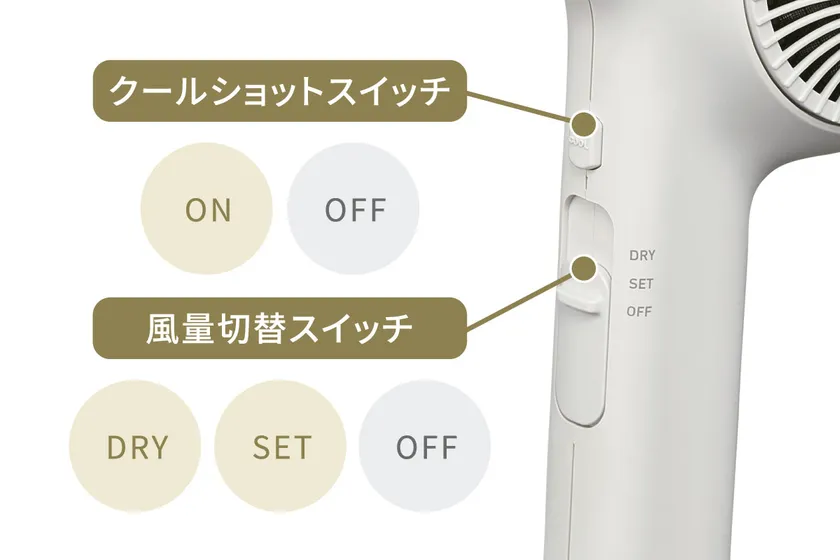 サロンでのヒアリングを活かした握りやすいグリップやワンタッチのクールショットスイッチなど、簡単で使いやすいデザインです。