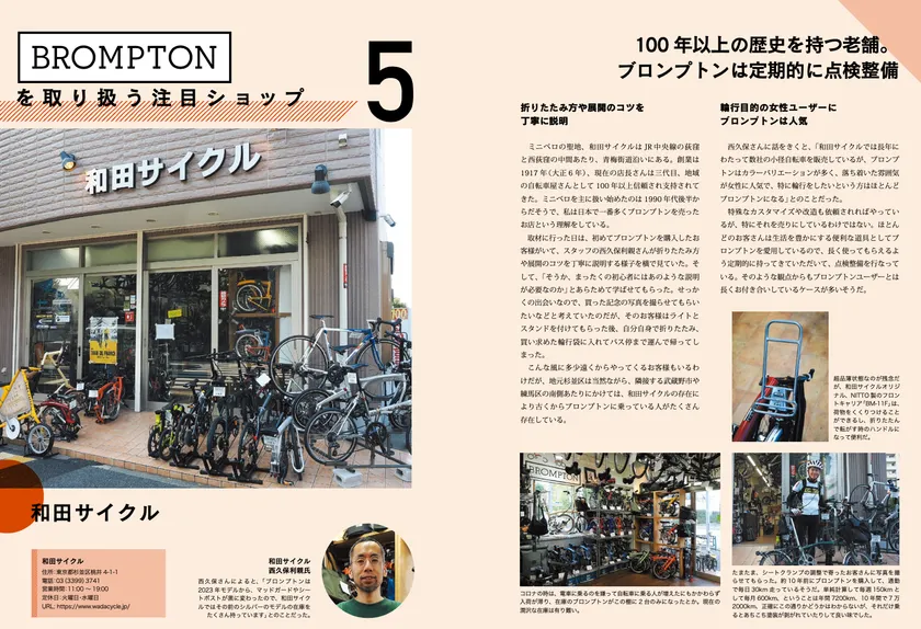 現在、日本でブロンプトンを取り扱っている主要ショップは100店舗ほどありますが、「BROMPTONを取り扱う注目ショップ」として関東近郊の5店舗にクローズアップ。商店街にたたずむ自転車屋さんから、カスタマイズに長けるお店、そしてブロンプトン・ブランドに特化した専門店までバラエティに富んだショップ紹介企画は、これからブロンプトンを購入したい、カスタマイズを施して自分仕様のオリジナル自転車に仕上げて思う存分楽しみたいと考えている方々には大いに役立つはずです。