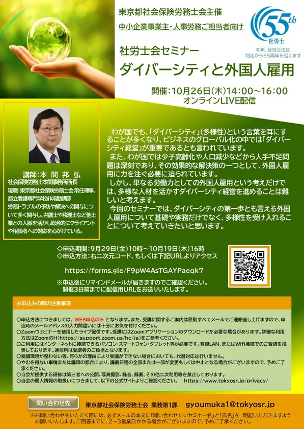 東京都社会保険労務士会主催オンラインセミナー 「ダイバーシティと外国人雇用」を10月26日(木)に開催