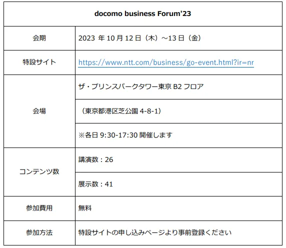 ドコモグループの法人事業ブランド「ドコモビジネス」のもと事業を展開するNTTコミュニケーションズ株式会社(以下 NTT Com)は、最新テクノロジーとユースケースを取り揃えたイベント「docomo business Forum'23」( https://www.ntt.com/business/go-event.html?ir=nr )(以下 本イベント)を、2023年10月12日(木)~13日(金)にザ・プリンス パークタワー東京(東京都港区)で開催します。