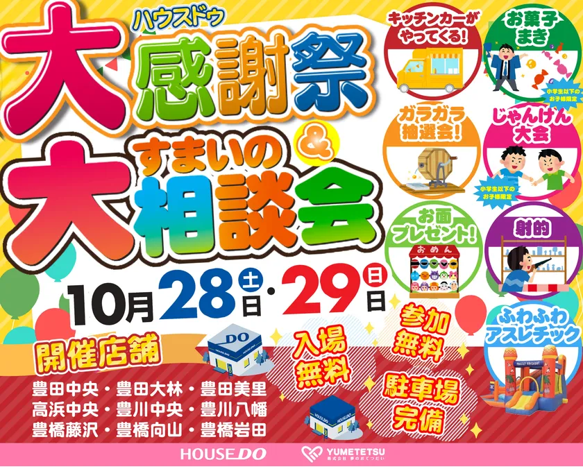 地域に密着した不動産仲介業を営む株式会社夢のおてつだい(本拠地:愛知県豊田市、代表取締役社長:山佳 永吉、略称:ゆめてつ)は、日頃のお客様への感謝の気持ちをこめて『秋の大感謝祭&すまいの大相談会』を開催させていただきます。