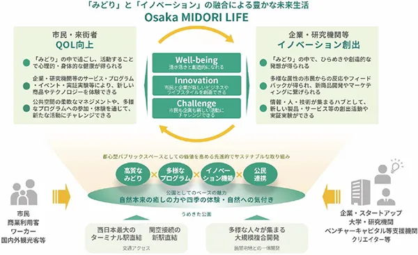 これまでの都市づくりのパラダイムを超えて、国籍や年齢、性別、障がいの有無など、多様性を受け入れて知恵を分かち合い、それぞれのQuality of Life(QOL)の向上を感じられる社会の構築に貢献します。そのために、「みどり」と融合した生命力あふれる都市空間や、イノベーション活動の起点となる施設、市民や企業など、さまざまな人々が新しい活動にチャレンジできる場や仕組みをつくり、活力に満ちた創造的なライフモデル“Osaka MIDORI LIFE”をうめきたから関西、そして国内外へと発信していきます。