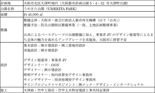 本公園は、JR大阪駅前に誕生する約4.5haの公園で、大規模ターミナル駅直結の都市公園としては世界最大級の規模を誇ります。事業者JVは、本年6月1日に、本公園のパークマネジメントとまち全体のエリアマネジメントを一体的に運営する組織「一般社団法人うめきたMMO」を設立しております。