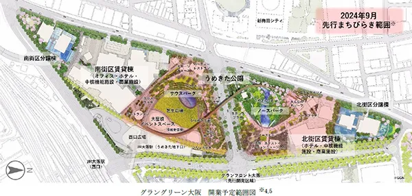 2024年9月に、グラングリーン大阪全体のうち、うめきた公園(サウスパークの全面・ノースパークの一部)及び北街区賃貸棟が先行開業します。なお、南街区賃貸棟は2025年春頃、うめきた公園後行工区(ノースパークの一部)は、2027年春頃に開業予定です。