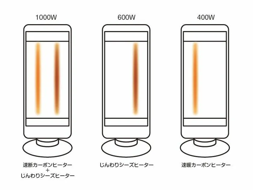 本製品は、電源を入れるとすぐに暖かくなる「速暖」タイプのカーボンヒーターと、赤外線の放出量が多く「体の芯まで暖かさが届く」シーズヒーターを組み合わせて3段階の暖め方ができ、管の背面にある熱反射板が熱を効率よく拡散します。