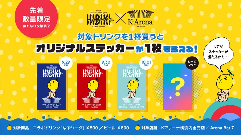 9月29日(金)~10月1日(日)の3日間、Kアリーナ横浜内売店にてゆずソーダまたはビールをご購入のお客様に、先着で当日限定オリジナルステッカーを配布いたします。(※無くなり次第終了)3日間それぞれ異なるステッカーデザインに加え、ランダムでレアステッカーも配布いたします。