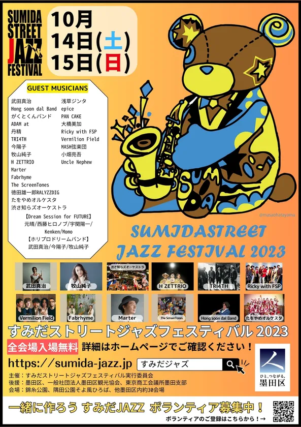 すみだストリートジャズフェスティバル実行委員会(実行委員長:青木 禎斉)は、2010年8月の初開催以来、墨田区恒例の音楽イベントとして、規模を拡大してきた全会場入場無料『すみだストリートジャズフェスティバル2023』を2023年10月14日(土)・10月15日(日)に開催します。