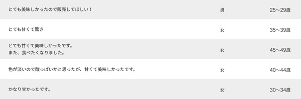 「東日本のエリアに販促活動ができる新しい取り組みとして実施させていただきました。アンケート内容やサンプリングの属性分析から好評が多かった性別や年代のデータを見ることが出来、今後のPRに生かしていきたいです。