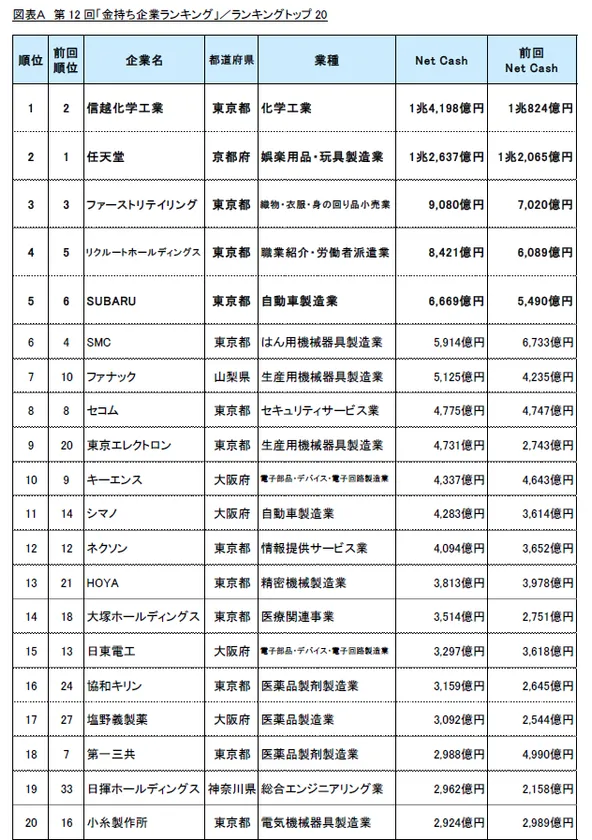 上場企業の決算短信(金融機関除く)の記載に基づきNetCash(※)を算出した結果、「金持ち企業ランキング」の1位は「信越化学工業」(NetCash1兆4,198億円)でした。次いで「任天堂」が2位(同1兆2,637億円)、「ファーストリテイリング」が3位(同9,080億円)となり、以下「リクルートホールディングス」(同8,421億円)、「SUBARU」(同6,669億円)、「SMC」(同5,914億円)、「ファナック」(同5,125億円)と続きました。