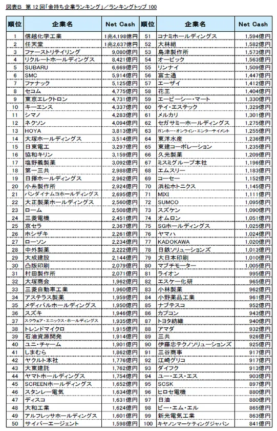 第12回「金持ち企業ランキング」は、1位「信越化学工業」、2位「任天堂」、3位「ファーストリテイリング」となりました。