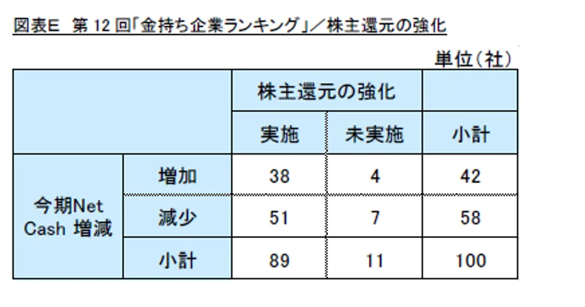 また、前回ランキング上位100社に対し、現預金の増減と株主還元策の関係について調査したところ、自社株買いおよび増配などの株主還元策を実施している企業は、100社中89社(89%)となっています。2022年における上場企業の自社株買いは、過去最高の9兆3,900億円を計上していることから、利益の株主還元が進んだこともNetCashが減少した一因であると考えられます。(図表E)