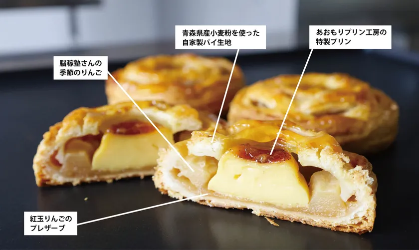 「あおもりプリン工房」のあおもりプリン(プレーン)をベースに、北海道産生クリームやパプア産のバニラビーンズを贅沢に使用したアップルパイ用プリン生地を新しく開発し、オーブンの高熱にも耐性がある独自のプリンを作りました。