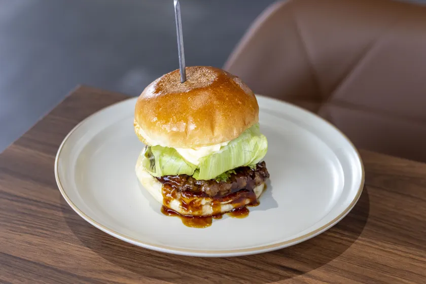 「ettoミートソースバーガー」は当店の看板商品です。手作りバンズを使用しふんわりと仕上げ、黒毛和牛100%のパティ、レタス、トマト、玉ねぎ、こだわりのミートソース、香りづけのアクセントとして燻製ベーコンも入っています。レタスのシャキシャキ感を出すために全体をつぶさずに1枚1枚包み込んでラッピングすることにもこだわっています。一度食べるとやみつきになるハンバーガーです。