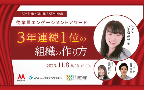 そこで今回、従業員エンゲージメントアワードで3年連続1位を獲得した株式会社メッセ様に登壇いただき、自社の実例を基にエンゲージメント向上に成功した組織体制についてお話しいただきます。