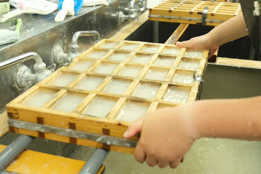 広島県府中市はデニムや家具、味噌など、ものづくりが盛んなまち。伝統産業を担う地元企業から製造過程で生じる廃材をご提供いただき、これまでに当社のオリジナル商品として「インディゴデニムペーパー」「府中家具の木くずぺーパー」「府中味噌ペーパー」を開発・発売しました。素材の配合や手漉き作業などは、紙漉き事業を行っている障がい者施設にご協力いただいております。