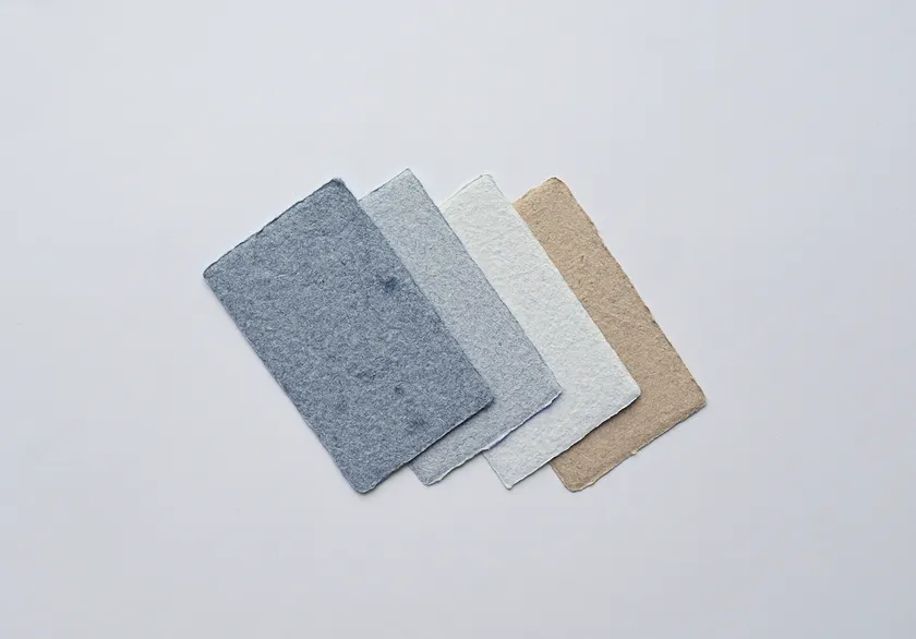 デニム、家具、味噌、醤油、古新聞、コーヒー、折り鶴など、さまざまなジャンルの廃材をアップサイクルした全11種類の再生紙をご用意。業種や商品コンセプト、企業メッセージに適した商品をお選びいただけます。サイズや厚みの調整に関するご相談にも応じます。また、紙の卸も承っています。