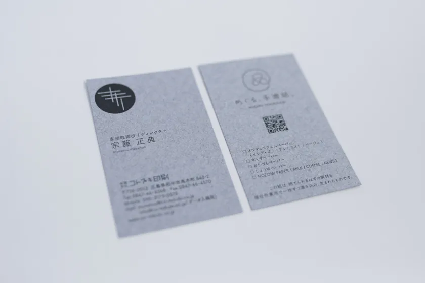 「めぐる、手漉紙。」の紙は、SDGsの活動に力を入れている企業様・店舗様の営業活動・広報PR用ツールとしてもご好評いただいております。独特の凹凸感やふっくらとした厚みが魅力の手漉き紙は活版印刷での名刺作成が人気ですが、オンデマンド印刷も可能なため、従業員の名刺をはじめ会社案内パンフレットやDMなど、ある程度まとまった部数が必要な印刷物にも適しています。