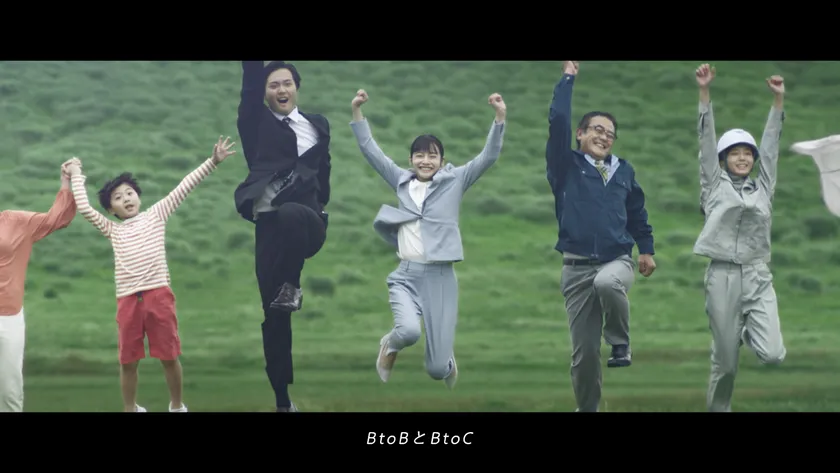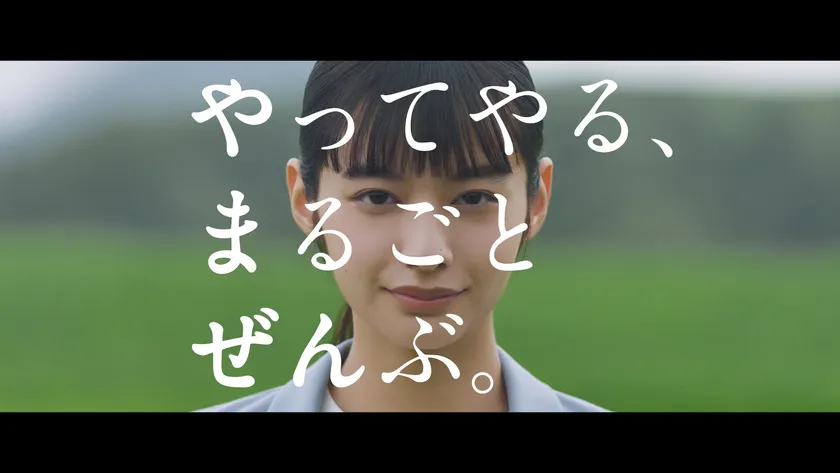 『大ジャンプ篇』と銘打った今回のCMの舞台は、とある大草原。主人公の女性(当社社員役)とメーカーのセールス、販売店の社長、当社商品のユーザーなど、様々なステークホルダーに扮した大勢の人々が一列に並ぶ中、カメラは主人公の女性にフォーカス。直後に全員が意を決して前に走り出し、一斉に『大ジャンプ』します。カメラは、一致団結した壮大なジャンプを様々なアングルから捉えたあと、着地する登場人物にフォーカス。決意の笑みを浮かべる主人公の顔のアップに、「やってやる、まるごと、ぜんぶ。」というタイトルが重なります。そして、当社のパーパス「ともに、未来を切拓く」が入ったロゴでCMは終わります。