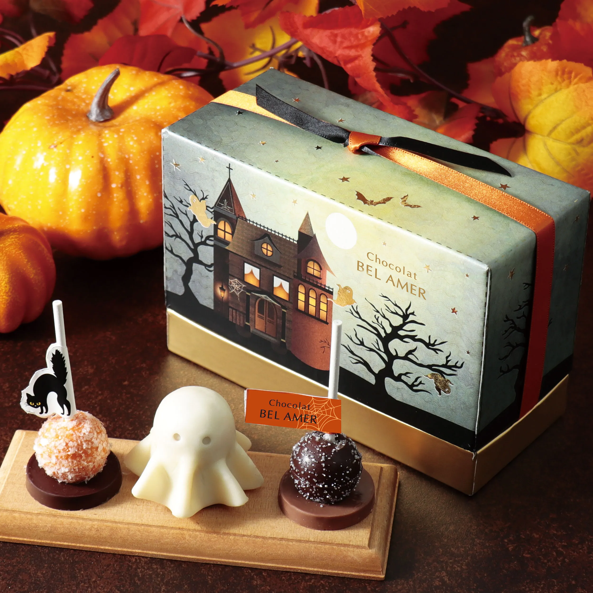 かぼちゃや紫芋のフレーバーのロリポップと、シーツをかぶったオバケ型のチョコをアソートしました。