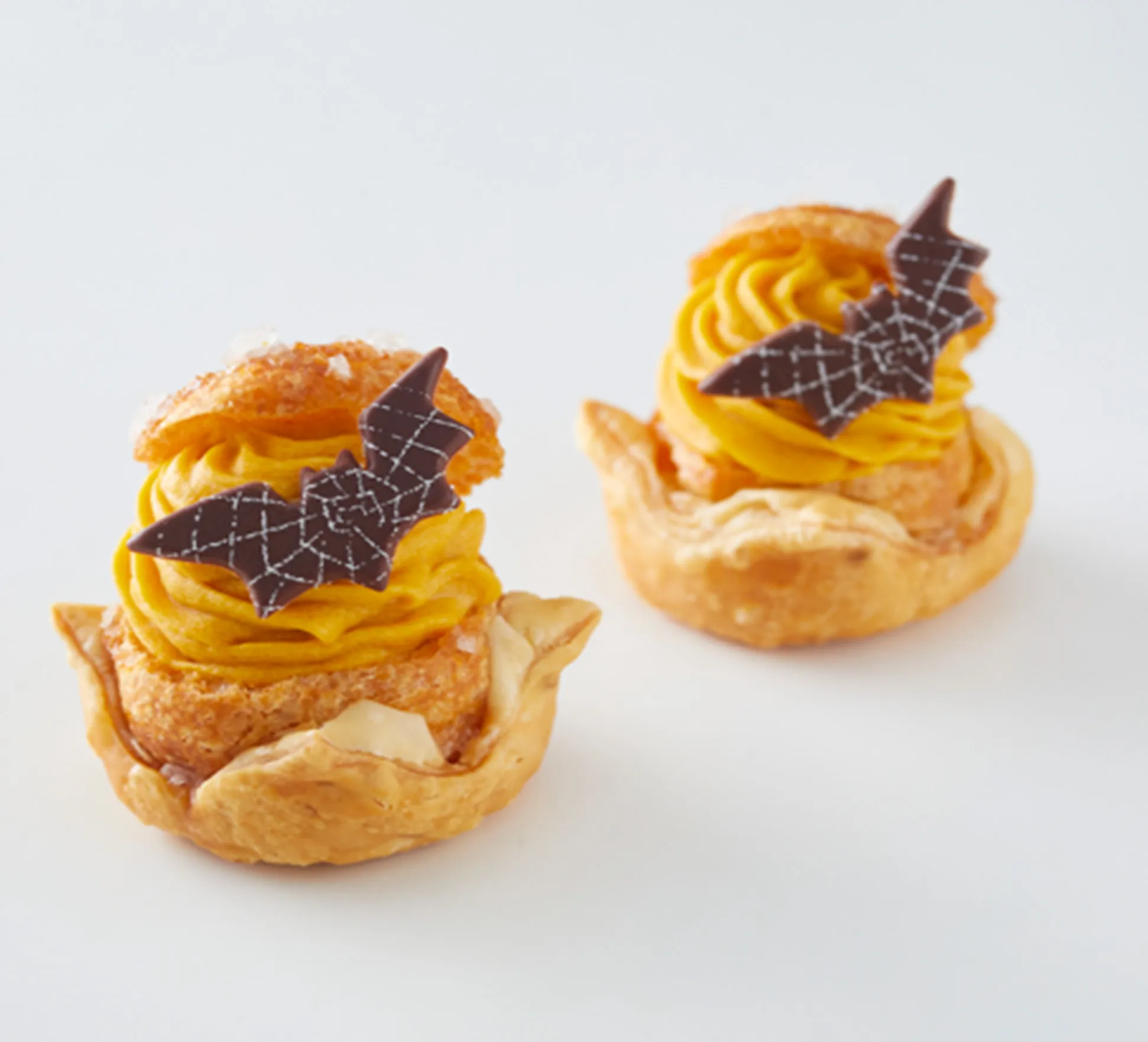 たっぷりのかぼちゃクリームに添えられているのは、蜘蛛の巣が描かれたコウモリ型のチョコレート。ハロウィーン限定のミニパイカスターです。