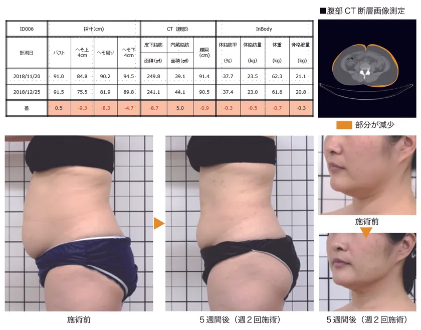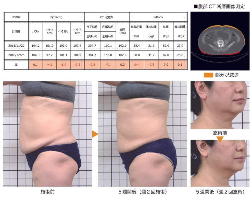 本剤の有用性(脂肪減少効果)を確認することを目的に、29歳~59歳までの一般女性10名を対象にした、エレクトロポレーション導入装置による本製品の皮膚導入試験を、10回(週2回×5週間)実施したところ、CT画像・体組成分析測定および採寸の結果、被験者の90%に導入部位の脂肪減少による改善傾向が確認されました。