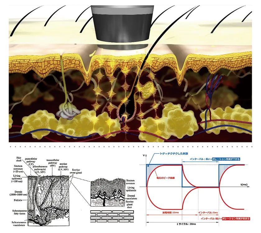 エレクトロポレーション導入技術は、肌に短く強い特殊な電気パルスを与えることで、上皮細胞、特に肌に既存する毛穴や汗腺といった孔の内壁細胞に透過経路を形成し、これによって、通常では浸透しない親水性分子や、高分子のヒアルロン酸、サクシノイルアテロコラーゲンをはじめ、フコキサンチン、ホスファチジルコリン、FGF-1、FGF-7、コンドロイチン硫酸、N-アセチルグルコサミン、MSM等の有効成分を真皮層下まで導入することが可能になりました。当社のエレクトロポレーション導入マシン「イーポレーション・シリーズ」は、エステ・医科ルートにおいて業務用エレクトロポレーション装置としては、最大の導入実績を誇っています。