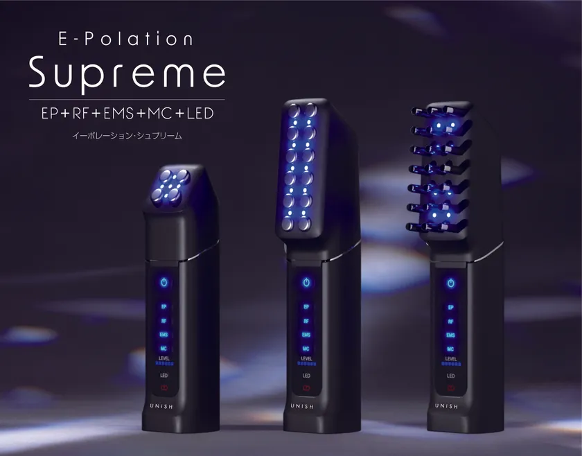 当社のエレクトロポレーション導入技術が搭載された最新の家庭用機種「イーポレーション・シュプリーム」が、10月30日に発売されます。本機は、標準付属の3種類のアタッチメントから、目的とする美容効果に対応したアタッチメントと、目的に応じた純正エッセンスを選択することにより、フェイシャルケア・ボディケア・スカルプケアを、1台でパーフェクトかつ最適なトリートメントを お楽しみいただける、プロ仕様のホームエステマシンです。