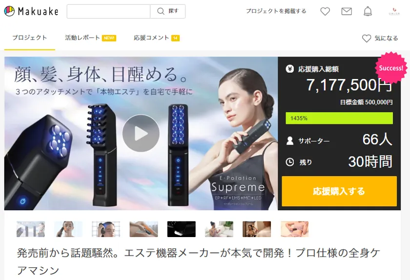 本機は、発売に先駆け、応援購入サービス「Makuake(マクアケ)」による先行販売を、8月29日~9月29日まで開催しています。本プロジェクトは、開始直後わずか3分で目標金額を達成し、既に1400%超を達成するなど、一般ユーザーの他、サロン事業者からも大きな注目を集めています。