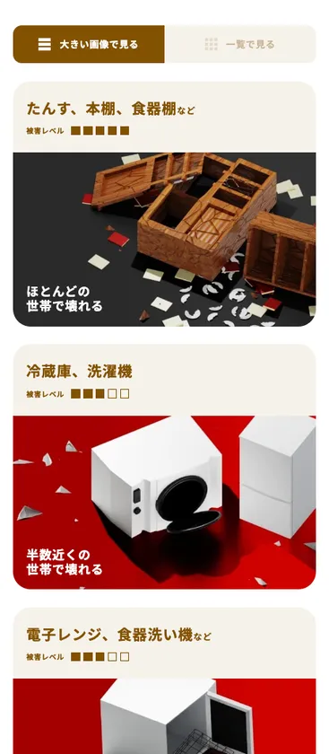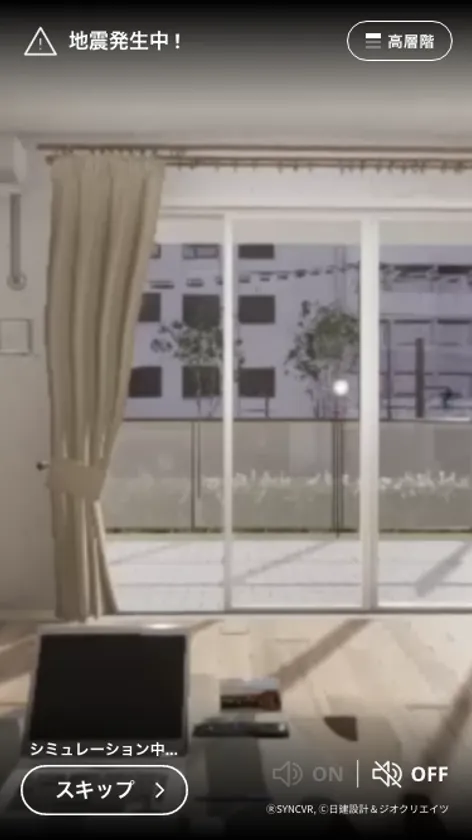 「地震こわれる診断VR」は、居住階(1階、5階、10階)と震度(5強、6弱、6強)を選択すると、部屋の中の揺れや家財の被害状況のシミュレーションをVR動画でリアルに体感できるコンテンツです。シミュレーションにあたっては、防災科研による実大三次元震動破壊実験施設「E-ディフェンス」を用いた実験データに基づき算出しています。