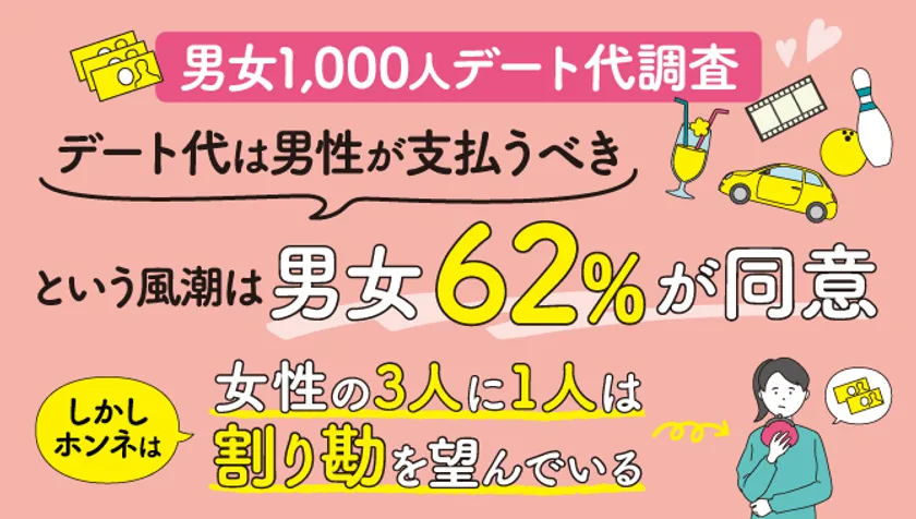 冒頭の意識調査で、「デート代は男性が支払うべき」という風潮に対して、「同意する」もしくは「ある程度は同意する」と回答したのは、男女ともに62%でした。