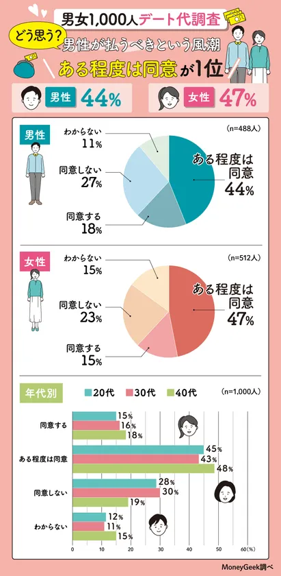 まず「デート代は男性が支払うべき」という風潮についての意識調査を行ったところ、「ある程度は同意」がもっとも多く(男性44%・女性47%)、「同意する」という回答と合計した同意派の割合は男女ともに62%という結果になりました。