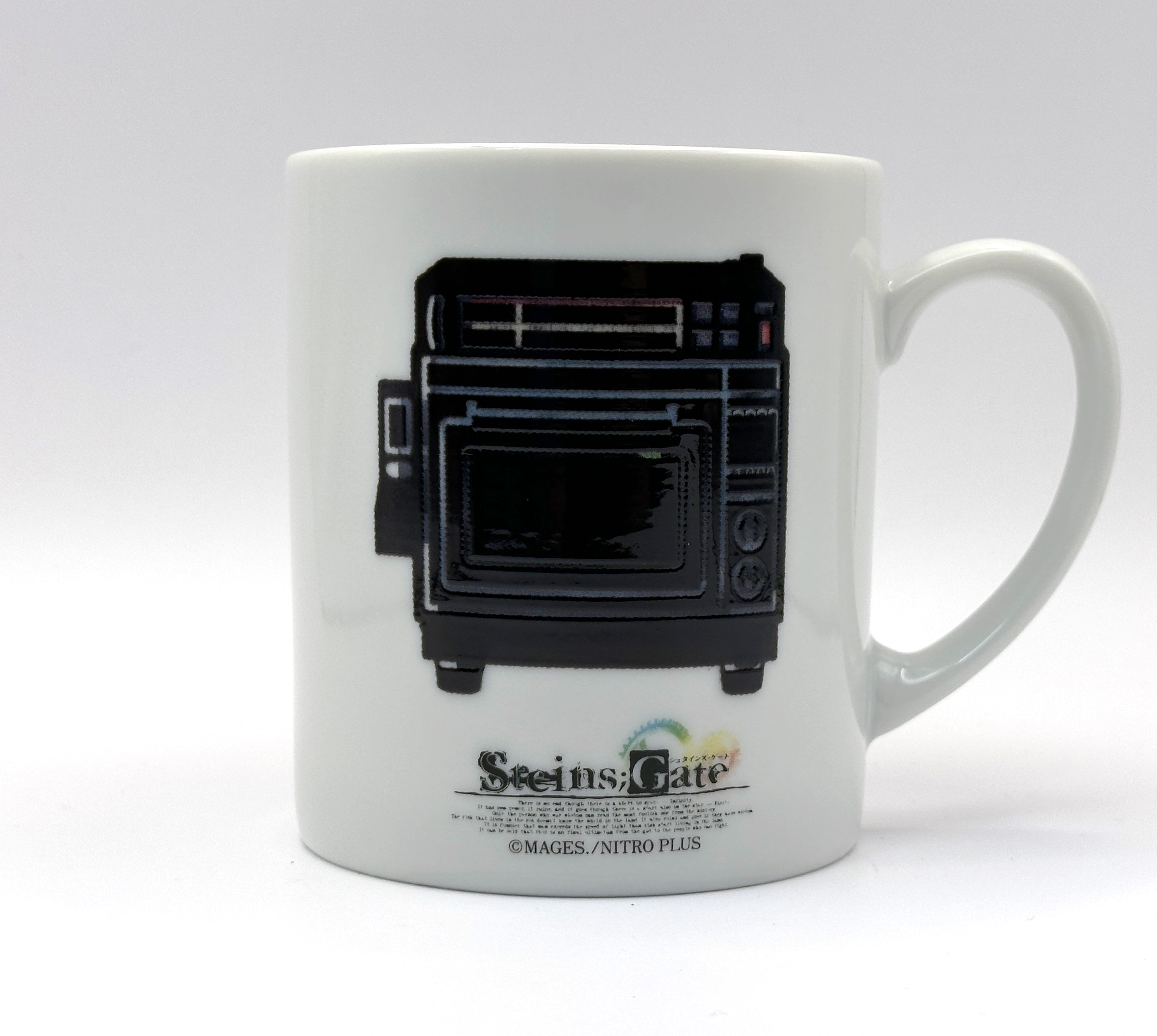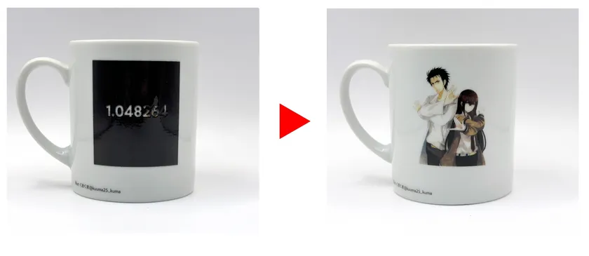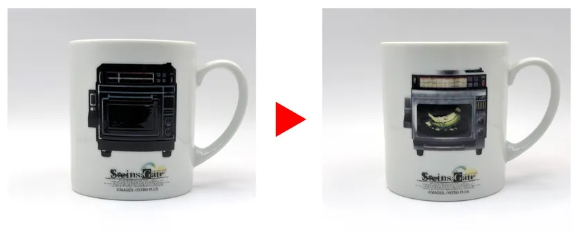 HOTの飲み物を入れると、正面は電話レンジ(仮)からゲルバナが出現し、背面では狂気のマッドサイエンティスト鳳凰院凶真と助手である牧瀬紅莉栖の二人が出現する仕掛けとなっております。ほっと一息しながら、温度で絵柄が変化する世界線をぜひご堪能ください。