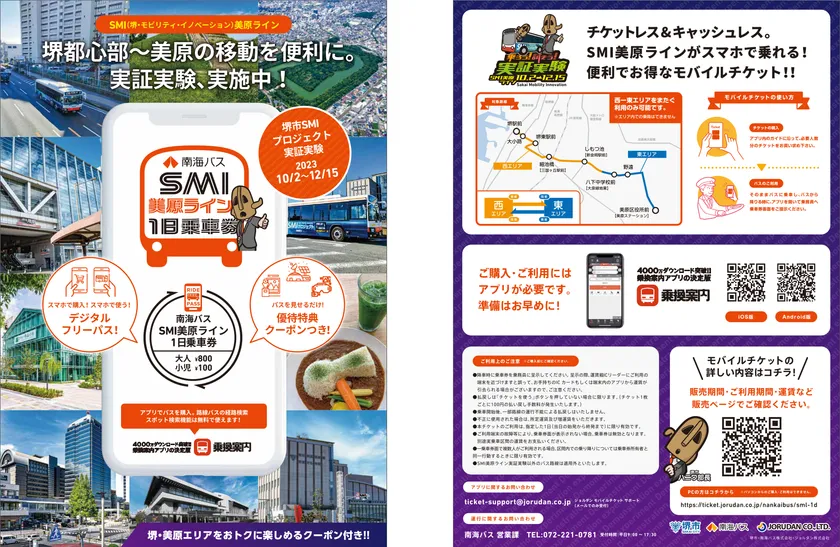 ジョルダン株式会社(本社:東京都新宿区、代表取締役社長:佐藤 俊和、以下「ジョルダン」)は、大阪府堺市、南海バス株式会社(本社:大阪府堺市堺区、取締役社長:藤原 隆)と協力し、2023年10月2日(月)から12月15日(金)の期間中、堺都心市部~市域東部を直通で結ぶSMI美原ライン実証実験で利用できる「南海バス SMI美原ライン 1日乗車券」を、9月22日(金)よりスマホから買えるモバイルチケットで販売開始しました。