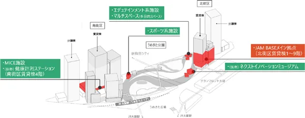 「JAM BASE」は、多様な人々が集い交わることで、アイデアやイノベーションが生まれることを目指す、本プロジェクトの中核を担う施設の総称です。「まざまざ と さまざま が まざるさま」をコンセプトに、北街区賃貸棟1~9階を中心として、まち全体にさまざまな施設を配置します。駅前かつうめきた公園との一体開発という利点を生かし、多くの人々が交われるよう、あえてさまざまな用途・機能を“ごちゃごちゃ”に混ぜ合わせ、一体感(つながり)を感じられるような施設配置や空間構成としていることが特長です。