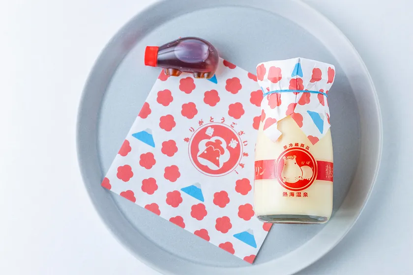 今回熱海プリン全店舗で、1番人気の「特製カラメルシロップ付」のかぶせ紙を、熱海市の花である梅の花と富士山をあしらったオリジナルの記念パッケージに期間限定で変更いたします。中央のお相撲さん風かばさんが可愛らしい、今限定のデザインです。この機会にぜひお買い求めください