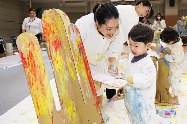 当日は、事前抽選で選ばれた12組(25名)の親子が参加しました。イベントの始めには、TABOTENZUブランド責任者が新商品とブランドへの想いを語りました。説明後には、TABOTENZUの新商品「かぞくのおえかきウェア」をご家族に着用いただき、えのぐあそびがスタート。 体育館いっぱいに広げられた模造紙や、1mのサボテン型ダンボール、そして子どもとおとながお互いのウェアに「ゆびえのぐ」をつけあいながら、汚れることを気にせず親子で思いきり“えのぐあそび”を楽しむ様子が見られました。 えのぐを指で混ぜたり、えのぐの付いた手でハグをしあって、親子で笑い合いながら、ウェアに思い出を残すシーンもございました。
