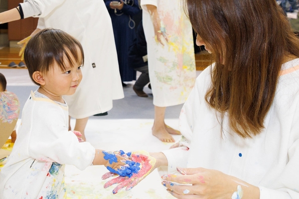 家では子どもを見守ったり、携帯で子どもの写真を撮る側になってしまうので、親子一緒に夢中になって、えのぐ遊びができて楽しかったです。おえかきウェアだと子どもの服が汚れる心配がないし、「逆に汚してもいいんだ」という感覚が面白かった!洗濯してまた使えるのもいいですね。子どもがきれい好きで、普段手が汚れるのを嫌がるタイプだけれど、今日は自分から足にえのぐを塗るなど、開放的な様子が見られて驚きました。