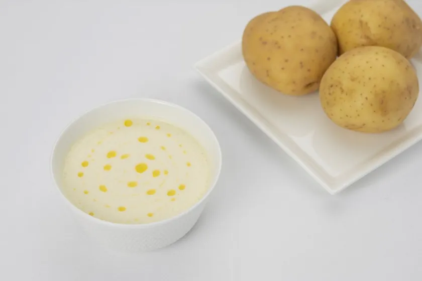 美瑛産じゃがいも「キタカムイ」と美瑛産玉ねぎの美味しさを生かしたクリーミーなポタージュ。特製チキンブイヨンと北海道産バターと生クリームを合わせて、なめらかな食感に仕上げました。