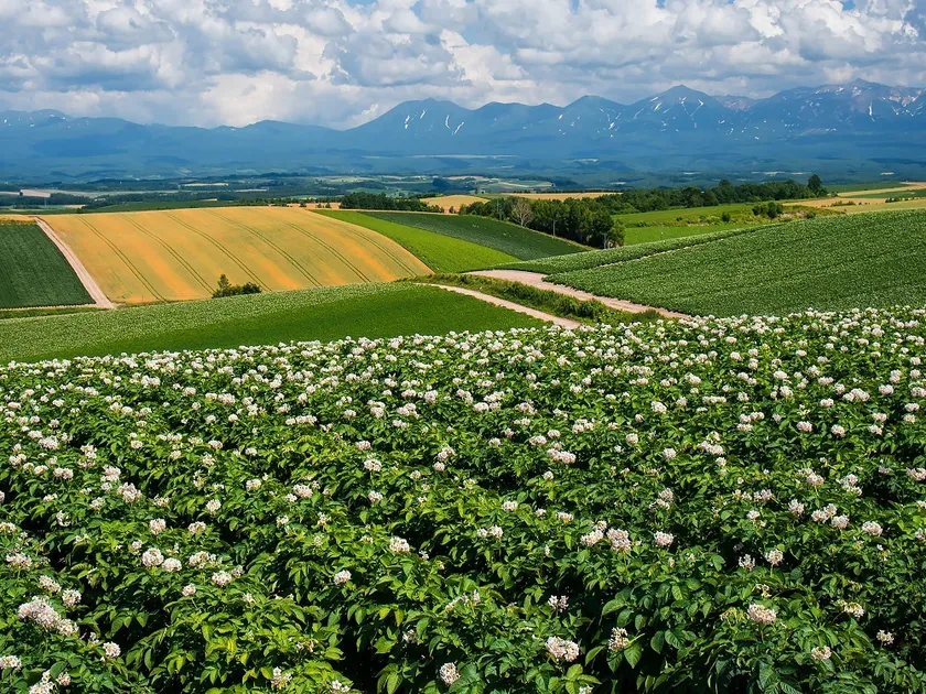 美瑛町の“パッチワーク”に例えられる風景と農業は密接に関係しています。じゃがいも、豆類、ビート(てん采)、小麦の4つの作物を、毎年同じ畑では作りません。これを4輪作と言って畑の健康と良い生育を保つために必要な取り組みです。毎年同じ畑に同じ作物を植えないため“2度と同じパッチワーク”の風景は無いと言っても過言ではありません。